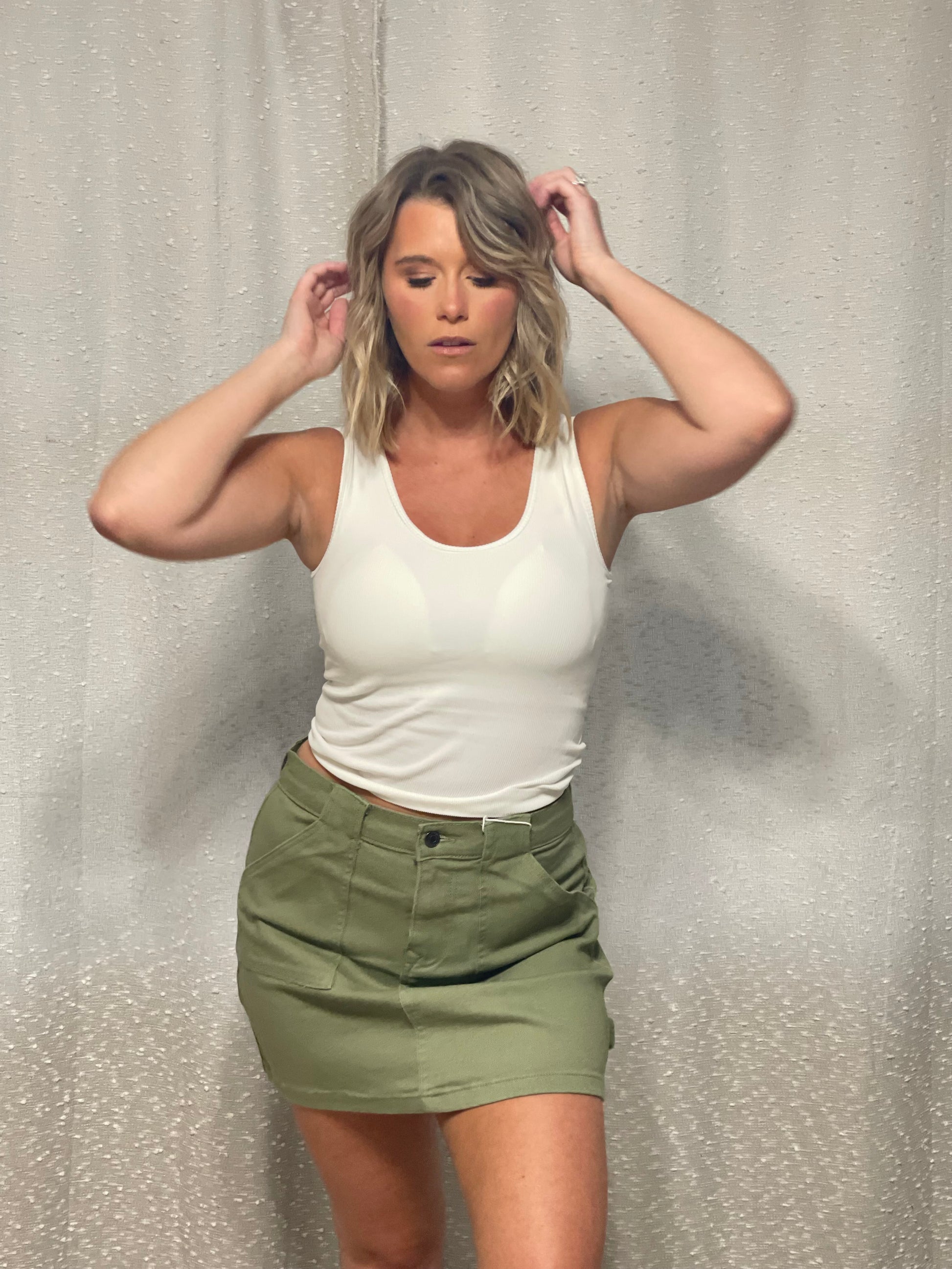 A cargo denim mini skirt combines the edgy style of cargo pants with the classic silhouette of a mini skirt, creating a trendy and versatile piece. The cargo pockets add a utilitarian touch to the denim skirt, providing both style and functionality. This skirt is perfect for creating casual yet chic outfits and can be styled with a variety of tops and shoes for a fashionable look.