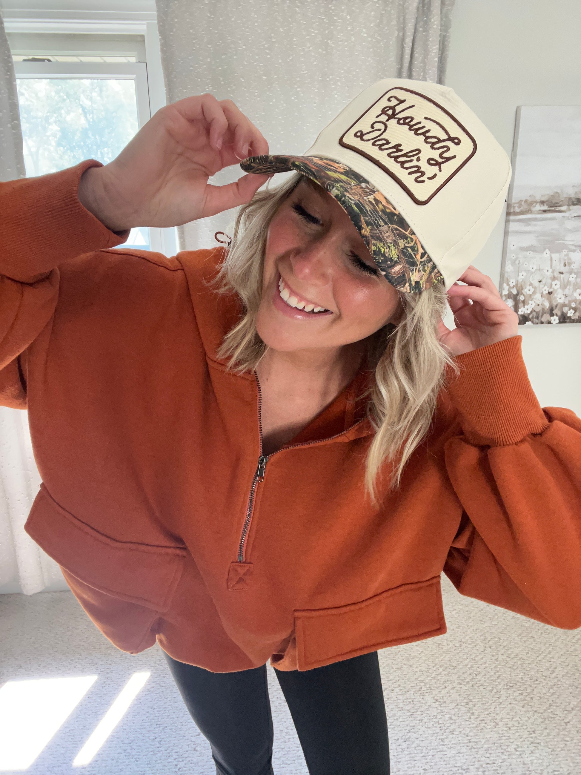 With its rugged camouflage pattern, this hat is perfect for nature lovers, outdoor adventurers, or anyone who loves a bold, rustic look. The playful Howdy Darlin' embroidery on the front adds charm and personality, making it a fun standout piece in any casual outfit. Featuring a breathable mesh back and an adjustable snap closure, this trucker hat offers all-day comfort and a secure, personalized fit. Whether you're out exploring, running errands, or relaxing with friends, this hat blends style and function effortlessly—an ideal addition to your everyday outdoor wardrobe.
